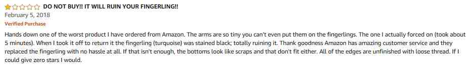 这位买家就表示:这是我在亚马逊上买过的最差劲的产品。衣服的胳膊太小了完全穿不进去,我大概花了5分钟才勉强给玩具套上,但是当我把衣服取下来的时候却悲催的发现,玩具原本的绿松石色已经被染成了黑色!如果这些理由还不够给差评,那么产品的底部看起来像是废料而且也不合适,衣服边缘的线都是松散的!如果有0这个选项我会毫不迟疑的给出0分。