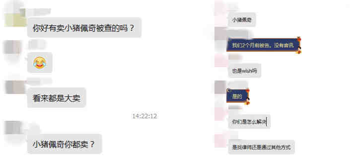 无独有偶,昨天,因侵权小猪佩奇被抓的Wish卖家并非个例,小编发现亿恩Wish维权群和别的卖家群内一大波卖家遭遇此事。