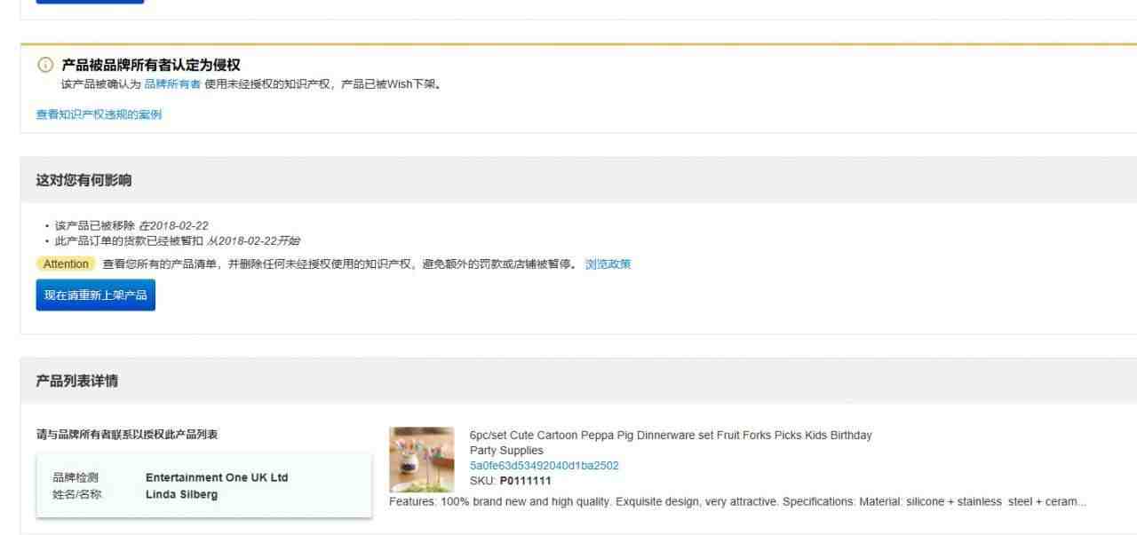 昨天,一位Wish卖家向小编爆料:我有款产品 2月份被查出侵权 peppa ,那是我第一次侵权这个牌子(wish有3次侵权的机会)当时wish已经移除这款产品,并且扣除该产品所有销售额。