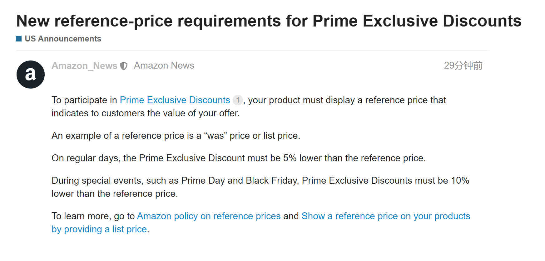 卖方通获悉,亚马逊美国站和日本站发布公告称参加Prime独家折扣的产品必须显示一个参考价格向买家报价,在正常日子,Prime专享折扣必须比参考价格低5%。在Prime Day和黑色星期五等特殊活动期间,Prime专享折扣必须比参考价格低10%,以下是公告内容: