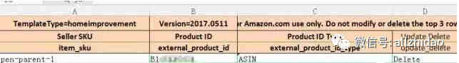 注意:Product ID可以填写ASIN、GCID、UPC等,如果要使用ASIN,那么就在Product ID Type手动输入ASIN。在Update Delete一栏中父商品首次上传,填写Update,子商品填写 Partial Update。