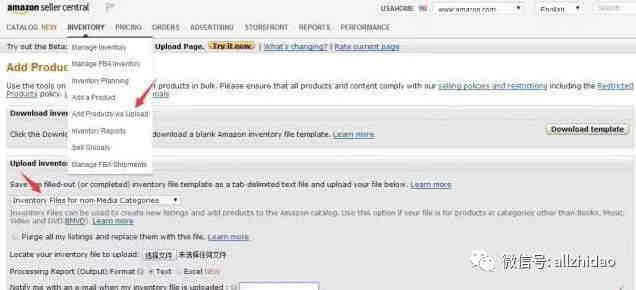5.其他详细的信息可以通过后台编辑listing,最后把表格另存为“文本文件(制表符分隔)或者 Text (Tab Delimited)(*txt)”进入Inventory> Add products Via Upload > Upload inventory files > Inventory files for Non-Media Category > click Browse > Upload now