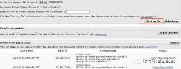 在页面有一个Check my file的选项,卖家可以先点击生产报告,让亚马逊检测表格是否有填写错误,如果有的错的可以根据生成的报告修改重新上传,如果没有错误的可以选择上传哦,一般5-10分钟之内就可以合并成功了。