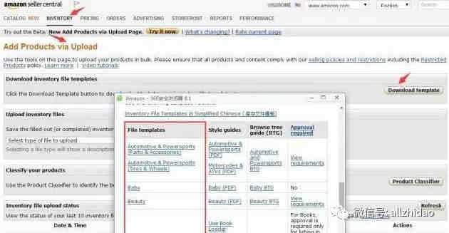 1、下载产品对应模板 通过Inventory > Add Products via Upload > Download Template,下载对应的产品模板。