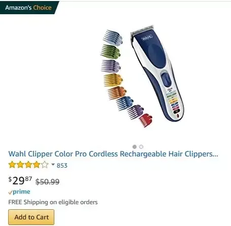 如果你使用略有不同的关键词搜索产品,那么获得Amazon’s Choice标签的产品也不同。例如,如果在亚马逊上搜索“hair clippers”,那么Amazon's Choice产品就是Wahl Clipper,售价29.87美元: 但当你搜索“hair cutter”时,亚马逊又会给出不同的Amazon’s Choice产品,这一次是飞利浦Norelco Multigroom,售价19.95美元。