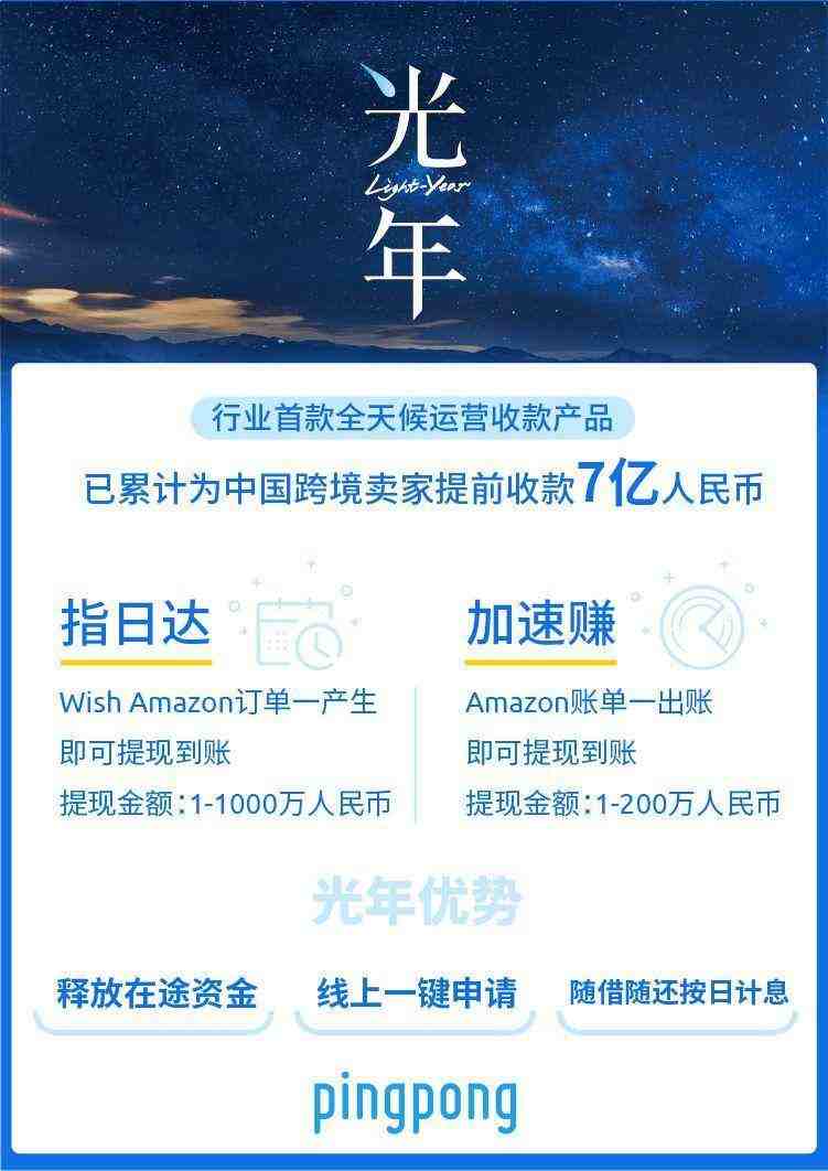 针对跨境卖家头疼的旺季资金问题,近期PingPong对广受好评的光年产品进行了全面升级,不仅为Amazon、Wish卖家加速资金流转,更提供了资金渠道,帮助更多卖家解决“缺钱”的问题。