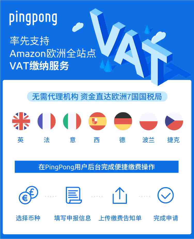 基于欧洲金融中心卢森堡颁发的欧洲支付牌照,PingPong与欧洲各国税务局紧密联系,为中国卖家提供开创性的VAT缴纳服务,率先支持Amazon欧洲全站点。