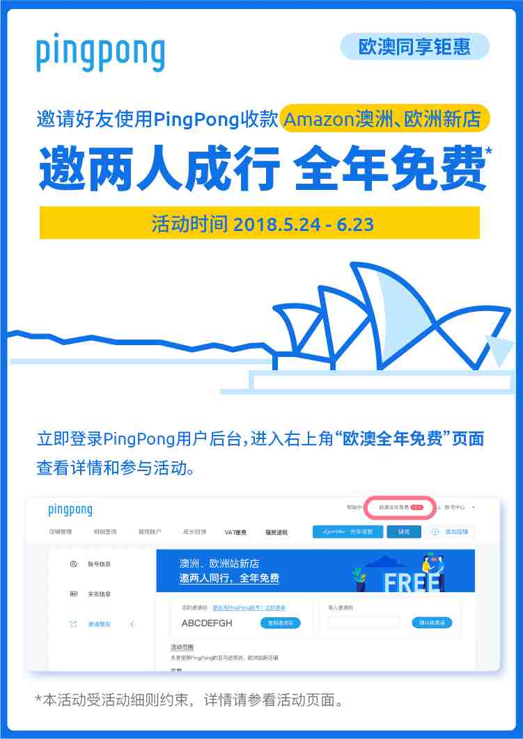 即日起至2018年6月23日,不仅是澳洲,PingPong用户添加欧、澳新店铺收款,邀两人成行,最高可享全年免费。*