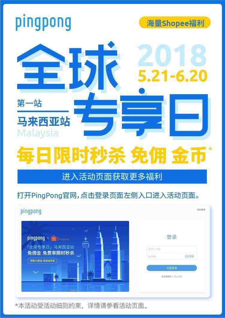 即日起至2018年6月20日,参与PingPong全球专享日第一站马来西亚站活动,领取优惠券,更有每日限时秒杀及2019全年Shopee收款费率5折的机会。*