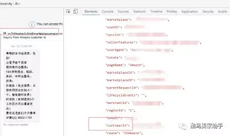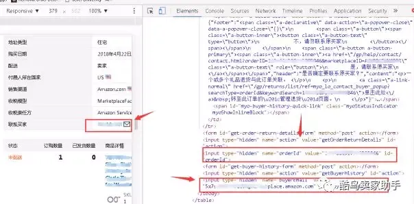 类似的操作,后台打开订单详情页,按F12,用刚刚代码页左上角的箭头选择,再点击左侧的“联系买家”,就会出现该订单的Order ID和亚马逊站内邮箱了;