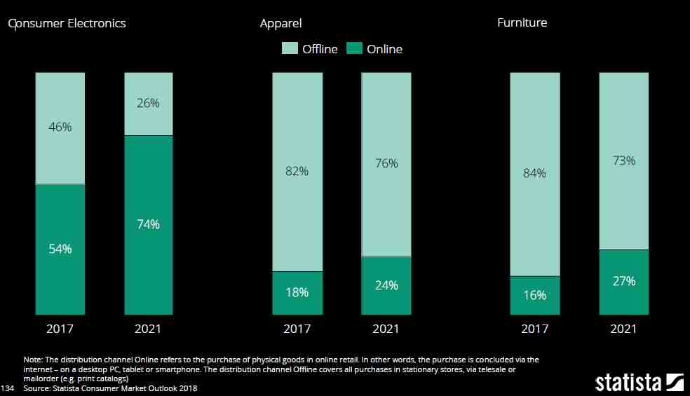 美国市场为例,据 Statista 预测,到 2021 年,电子产品在线销售份额将由 2017 年的 54%,显著提升至 74%;服装和家具在线销售份额也将有所增加。需注意的是,在此项统计中,“线上渠道”表示在线上零售商店购买实体商品,换句话说,购买行为是通过互联网——台式机、平板电脑或智能手机完成的。“线下渠道”包括所有从实体商店购买的行为,包括通过电话或邮件从实体商店订购商品。