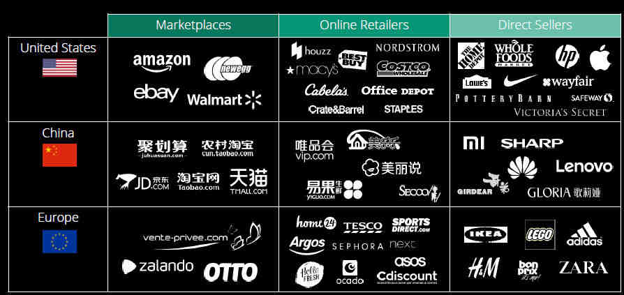 2017 年,全球电子商务市场总值 1.5 万亿美元,其中,中国及欧美发达国家仍是营收“大户”。