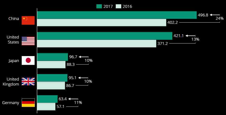 2017 年电商营收排在前五位的国家,分别为中国、美国、日本、英国和德国,其中日本、英国和德国,对应的营收分别为 967 亿美元、951 亿美元、634 亿美元,较上年分别增长 10%、10% 和 11%。