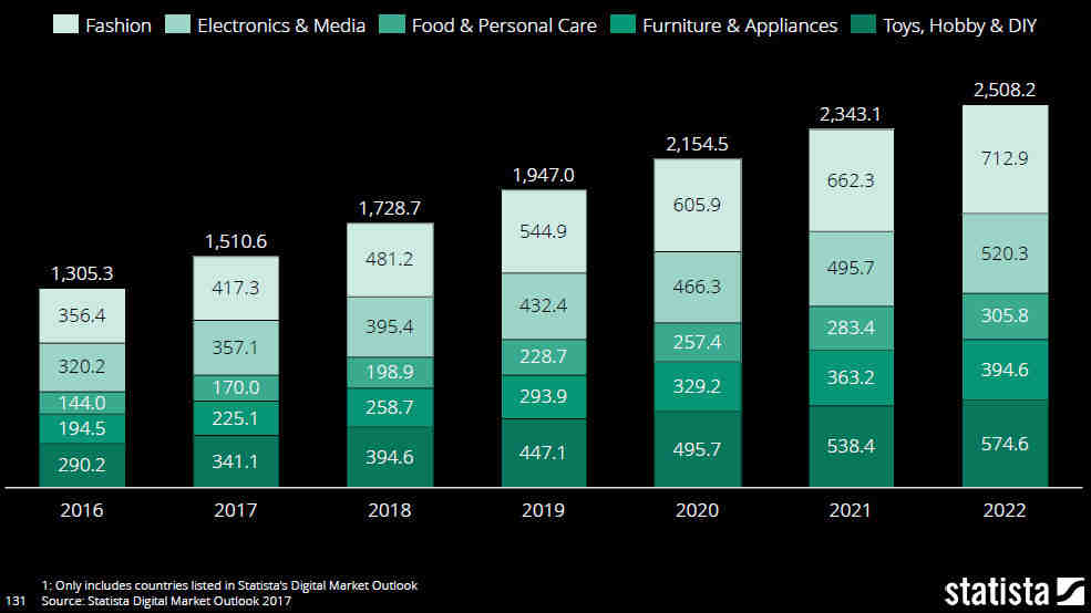 市场调研公司 Statista 发布的 DMO(Digital Market Outlook,数字市场前景分析),将电商市场商品划分为五大门类,即时尚、电子与影音、食品与个人护理、家具与电器、以及玩具与手工艺品。