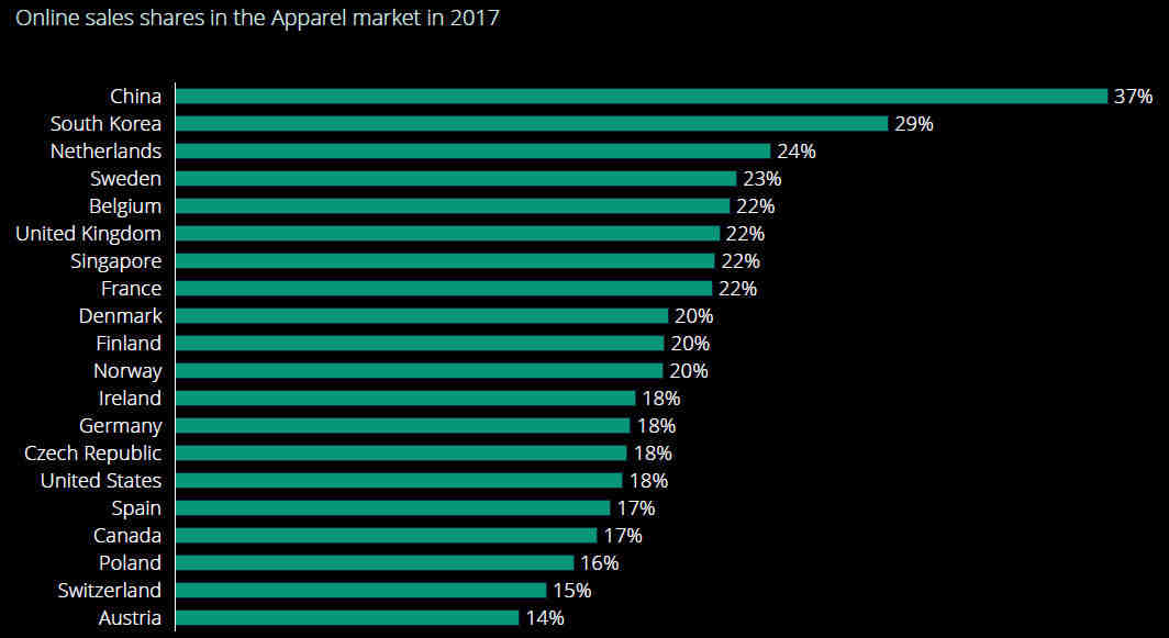但在不同市场,同样品类的商品“线上”或“线下”购买偏好有所不同。例如,在中国,37% 的服装销售是线上完成的,相比之下,美国这一比例仅为 18%。