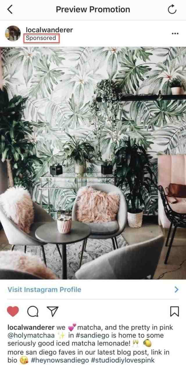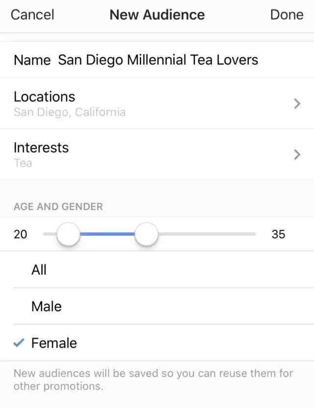 Instagram已经引入了一个“similar audience”的功能,你可以通过筛选兴趣、年龄范围和性别来选择你的目标受众。例如,如果你发布了圣地亚哥一间网红茶馆的照片,你可以将推广精确定位到到对茶感兴趣的人,住在圣地亚哥的人,并且是年龄在20-35岁之间的女性。但要确保你有引人注目的图片和一个有吸引力的标题。