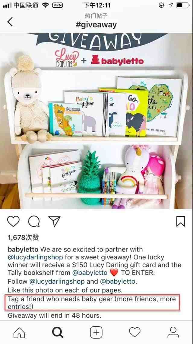 最常见也是最简单的活动方式就是让用户关注、点赞以及tag好友。当你让粉丝tag自己的好友时,你会接触到由你的品牌粉丝预先挑选出来的潜在粉丝群,然后这些潜在粉丝如果对你的品牌感兴趣又会继续参与这个活动,就会让越来越多的用户成为你品牌账户的粉丝。为了避免打扰到对品牌不感兴趣的人,可以像下面的例子一样加一句“tag a friend who needs baby gear”,粉丝就会有选择性地tag自己的好友,这样挑选的人群将会更优针对性。