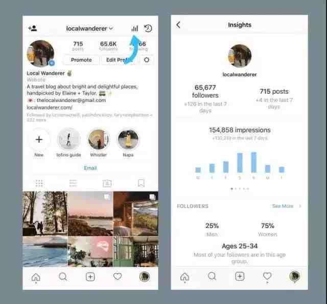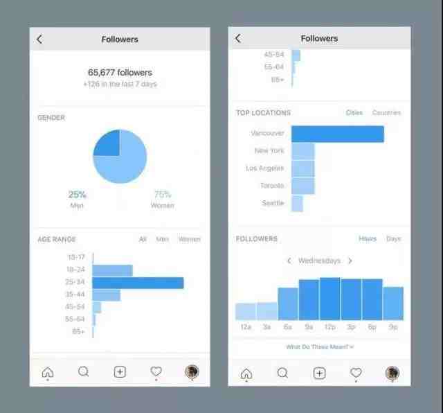 但这些都是一般的规则,为了找到你自己的品牌账户发布的最佳时间,你可以使用Instagram自带的Instagram Insights功能来分析你的受众群体在Instagram上最活跃的时间。还可以按国家或城市查看用户的位置信息,那你就可以知道在哪些时区发布可以吸引大多数的目标用户。