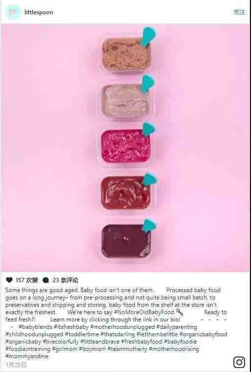 例如,Little Spoon是一家婴儿食品公司,其目标受众是准妈妈和刚有小宝宝的父母。Little Spoon使用如#organicbabyfood,#freshbabyfood等hashtag来描述自己的业务,以及给自己品牌打广告的hashtag,比如#itsfreshbaby,#nomoreoldbabyfood等。