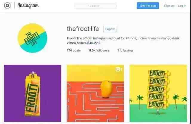 设计品牌在Instagram上独特的、易于识别的视觉风格。Instagram就像一本数字杂志,可以选择同类主题或感觉相同的内容。品牌商可以把品牌里面某个特定的元素应用到所有发布的内容,从而呈现出强烈的品牌风格,让用户更容易记住并识别品牌内容。例如下图的印度饮料品牌Frooti已经开发了这种独特的视觉内容风格。