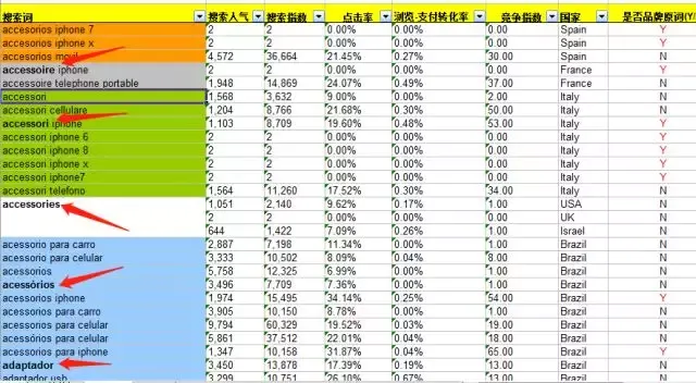 加粗的词是一些核心词,也是外国人比较喜欢使用的关键词。外国人比较喜欢简洁的关键词,一搜就可以出来很多产品,比如附件、配件有iphone的,也有iphonex的。从图中可以看出加粗的词在英语区竞争比较激烈,所以大家不妨换个思路,去做做小语种地区,可能会有意外的收获。