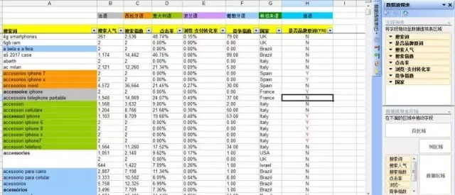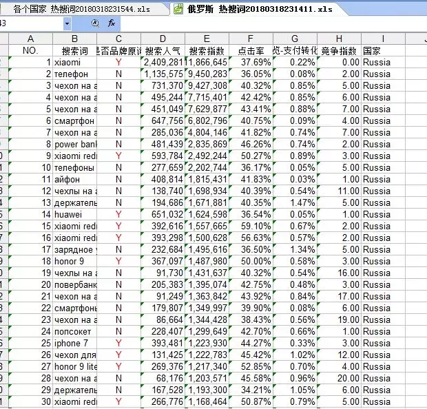 每个国家选择30天,点击右上角的“下载”,把这30天的数据下载到电脑。打开每一个数据表格,都会有搜索词、是否品牌词、人气点击率、转化率以及竞争指数的数据。