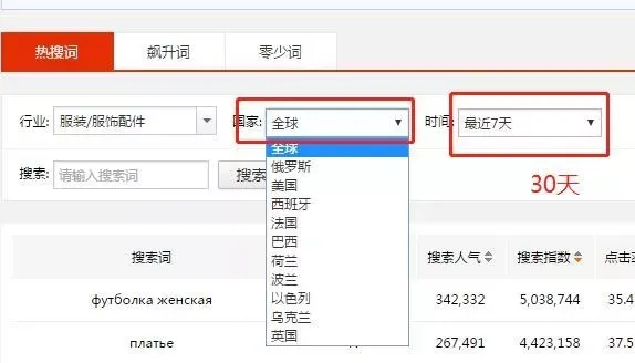 在速卖通的后台有一个热搜词版块,按行业、国家分类。当我们选择好行业(如服装配饰,电子产品等),选择类目之后,再选择相应的国家,建议做好选到具体的国家,如果选“全球”,关键词就会比较多。