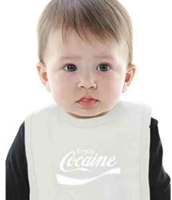 此外,该卖家出售的一款白色婴儿围兜也被列出,产品售价为8.99英镑,上面也印有“享受可卡因”的口号。