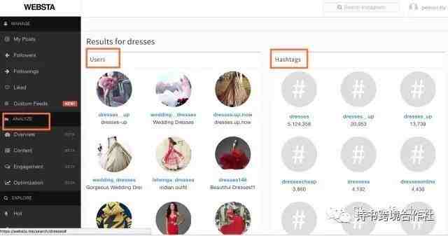 例如,我们在里面搜索dress,结果左边栏显示的是相关的用户,右边栏显示了相关的hashtags。