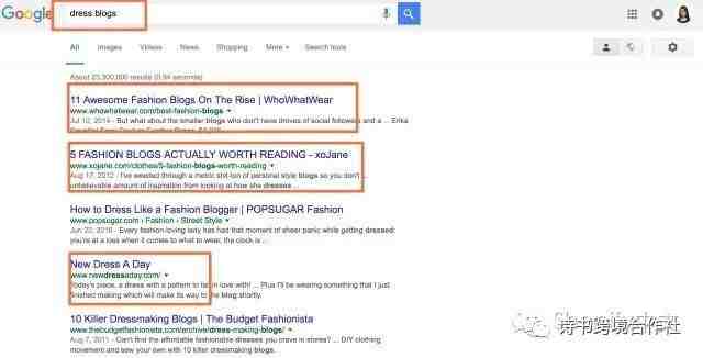 我们直接在google中输入关键词,比如“dress blogs”,搜索首页显示,已经有很多相关博客总结。你的搜索关键词越详细,得到的结果能和你的产品越匹配,但同时,越是细分领域的博主,粉丝数目可能会小一些。