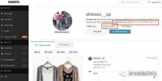 我们选择第一个ins用户“dresses_up”,打开她的ins页面,可以看到她的邮箱以及其他信息。