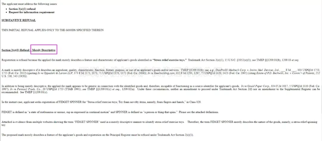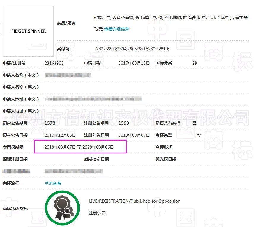 通过中国商标查询官网可知,28类的“fidget spinner”商标已经在2018年3月7日获准注册。但是这个商标名在欧盟和美国的申请都驳回了,原因也是商标为产品通用名词,缺乏显著性。