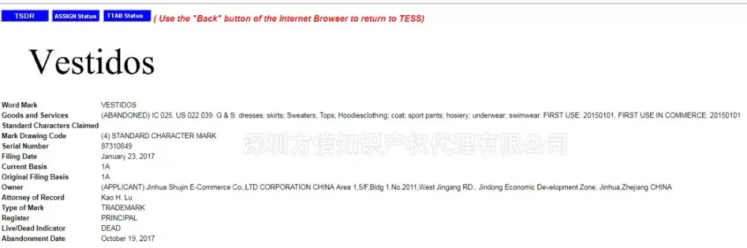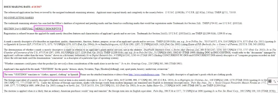 小编继续尝试在欧盟和美国检索“vestido”(服装)一词,欧盟25类商标中没有“vestido”商标,然而,存在美国商标“vestidos”,不过,其状态为Abandont--放弃申请。该商标申请是被驳回的,驳回的原因就是“vestidos”为产品名称,直接描述产品(merely descriptive)。见下图: