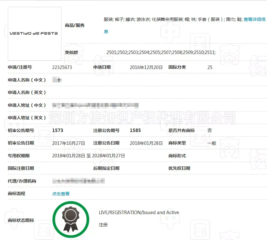 欧盟和美国没有商标申请记录,但是在中国“vestido de festa”在2018年1月28日获准注册,注册25类--服装,如下图: