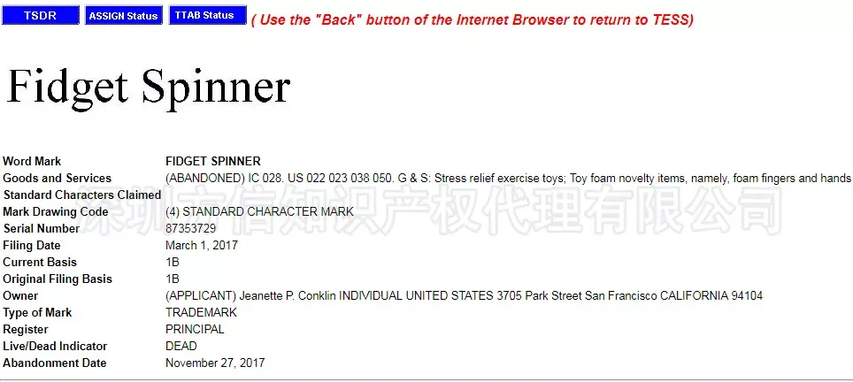 无独有偶,去年的玩具爆款--指尖陀螺的英文“fidget spinner”在欧盟、美国和中国均有申请的记录,如今“fidget spinner”的命运如何呢?
