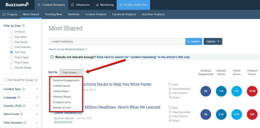 BuzzSumo旨在简化内容创造者的内容研究过程,你只需在工具中输入特定关键字就能看到当前最流行的相关内容。内容将根据来源,如Facebook、推特、Pinterest等进行分类。此外,你还可以对内容来源范围(如国家等)进行过滤,以便更清楚地了解目标受众。