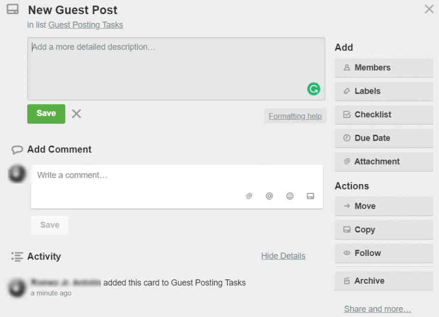 你可以在Trello中创建待完成任务卡,输入需要完成某一任务的人员名字,以及所有相关细节、完成日期等,你还可以在人物卡中上传附件,并对任务进行评论。