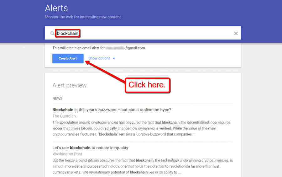 如果你有一个谷歌帐户,你只需在GoogleAlert中输入你关注的关键字,点击“CreateAlert”即可: