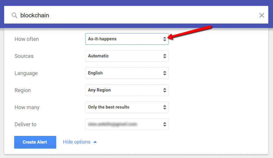 要获得实时提醒,单击“Showoptions”(显示选项)下拉菜单,然后在“Howoften”对应框中选择“As-it-happens”(实时发送)设置通知发送频率: