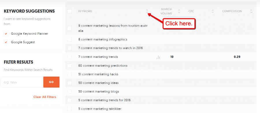 有时,Ubersuggest给出的一些结果包含两三个长尾关键词,可以直接当做标题使用,你可以点击下图位置,在搜索结果中优先呈现这类关键词: