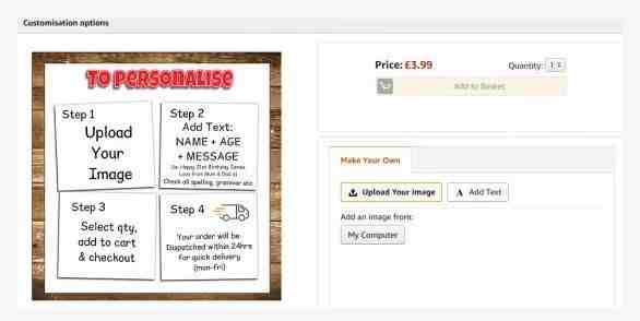 当买家点击“Customize Now”按钮时,页面会提示买家提供定制文本、图片或勾选其它选项,所有定制细节填写完毕后,买家点击“Add to Basket”并支付,所有定制细节收费都将包含在订单中,发送到卖家哪里。