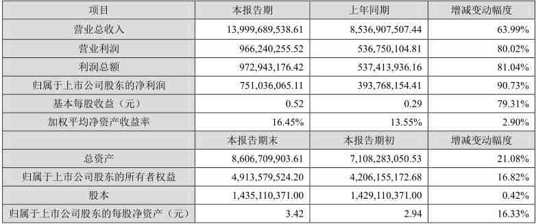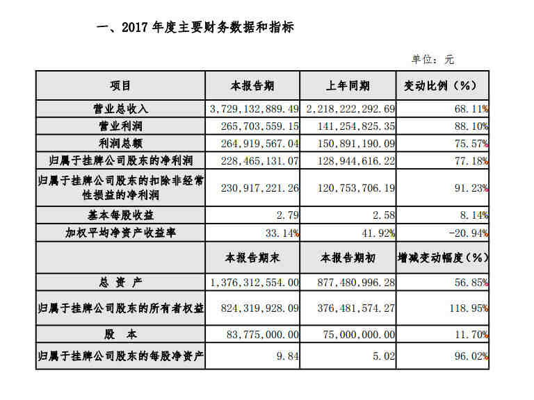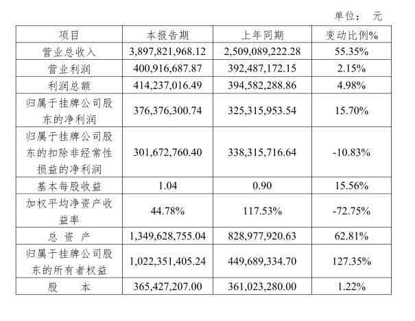 报告期内,公司营业总收入3,729,132,889.49元,同比增长 68.11%;实现营业利润265,703,559.15元,同比增长88.10%;实现利 润总额264,919,567.04元,同比增长75.57%;实现归属于挂牌公司股 东的净利润228,465,131.07元,同比增长77.18%。