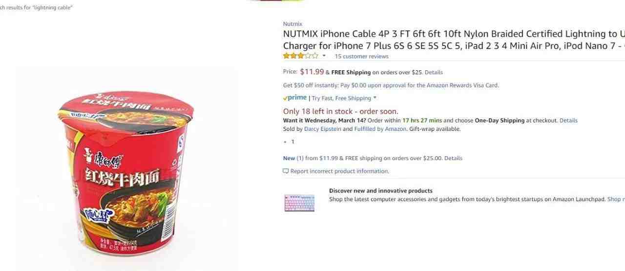 图片是一款中国产康师傅红烧牛肉桶面,傻子都知道方便面桶身书写的是中文,而产品描述是一款充电线。