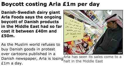 斯堪的纳维亚半岛上最大的乳制品生产商Arla Foods(中文名为“爱氏晨曦”),生产的黄油、奶油、奶酪等商品曾在中东市场占主导地位。2005年时,正是Arla在中东高速发展的时候,当年的销售额达到5.5亿美元。