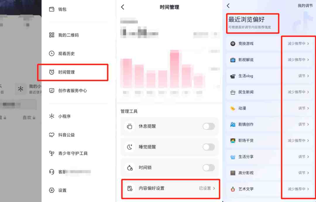 我们只要进入时间管理进入内容偏好设置即可调节推荐程度;