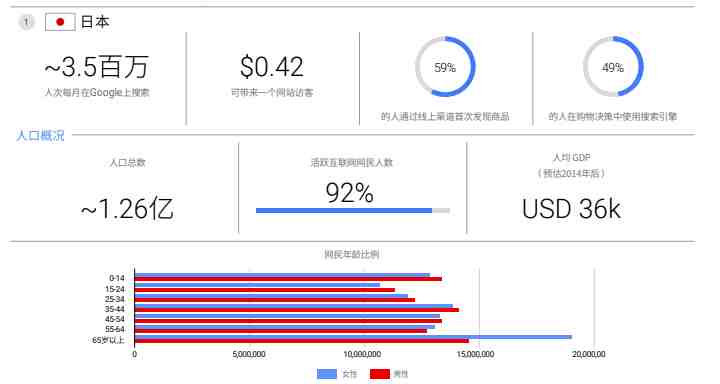 比如你出口正装,想进军日本市场,全球商机通从人口、互联网使用习惯、设备概况和商业概况等19个方面为你全方位分析。