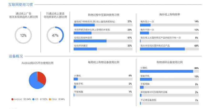 从互联网使用上,你能看到客户寻找信息的渠道、海外购物频率等,如果你要进军当地市场,那你就要对症下药,47%客户只在网上搜索信息,那他们搜索的时候你一定要出现。大家购物时使用计算机占88%,那你营销要更多瞄准电脑端。