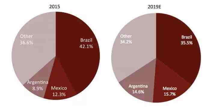 电商增长速度仅次于亚太地区的拉丁美洲,有30多个国家,人口超过6亿。到2019年,拉丁美洲的网购人数能达到1.5亿,电商零售额847.5亿美元。