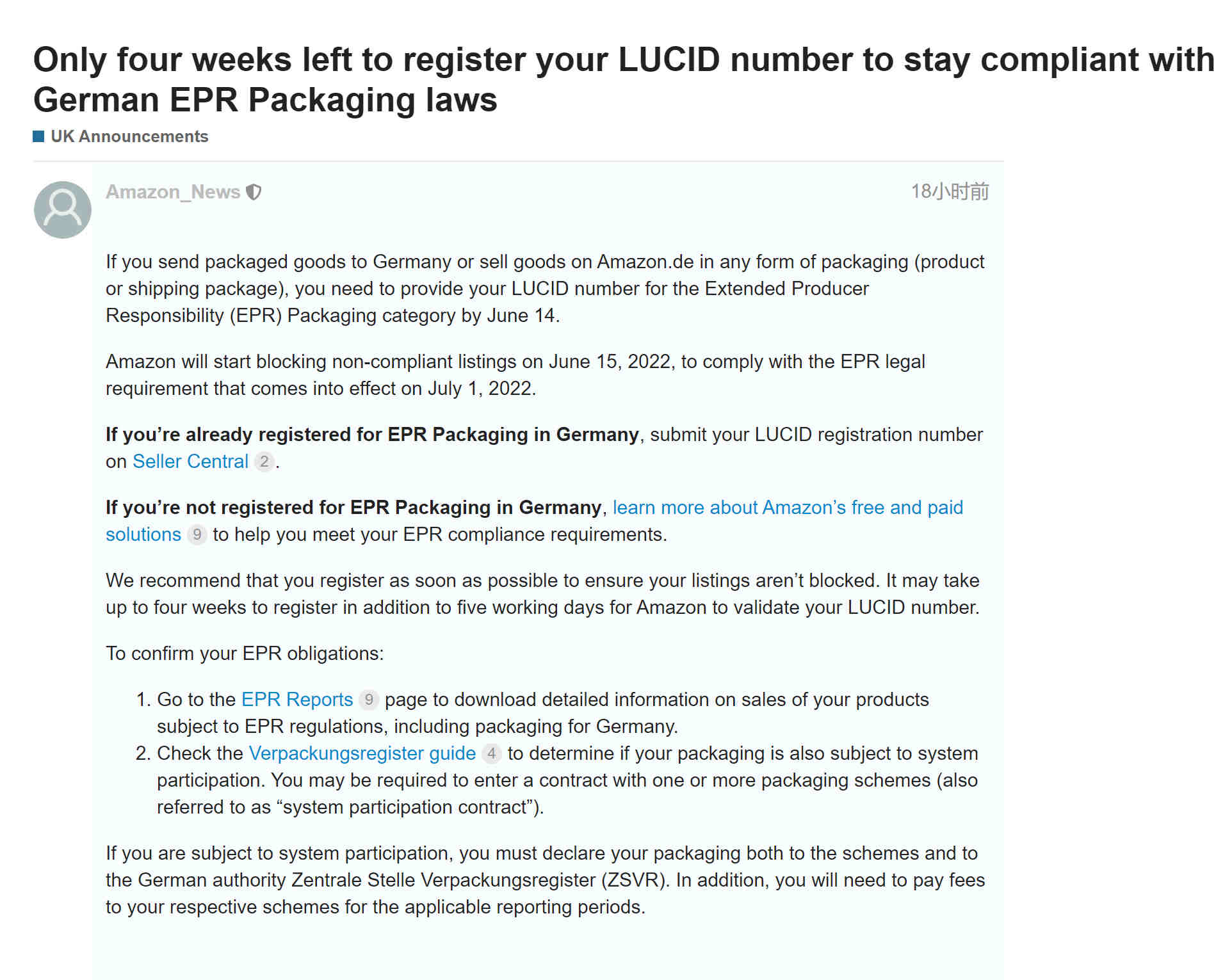 卖方通获悉,亚马逊德国站发布公告称2022年7月1日德国EPR包装法即将生效,亚马逊要求卖家在6月14日之前为扩展生产者责任(EPR)包装类别提供LUCID编号,否则将屏蔽不合规产品,以下是公告内容: 如果卖家将包装好的产品发送到德国运营中心或在Amazon.de上销售带有任何形式包装的产品,则需要在6月14日之前为扩展生产者责任(EPR)包装类别提供LUCID编号。亚马逊德国站将于2022年6月15日开始屏蔽不合规的产品,以遵守将于2022年7月1日生效的德国EPR包装法。 如果卖家已经在德国站注册了EPR Packaging,请在卖家中心提交您的LUCID注册号。如果卖家没有在德国注册EPR Packaging,请详细了解亚马逊的免费和付费解决方案以帮助您满足EPR合规性要求。 亚马逊验证LUCID号需要5个工作日,卖家注册LUCID号最多也可能需要4周时间。亚马逊建议卖家尽快注册LUCID号,以确保产品列表不会被屏蔽。 确认卖家的EPR义务: 如果产品包装受制于系统参与,卖家必须向包装计划和德国当局Zentrale Stelle Verpackungsregister(ZSVR)申报您的包装。此外卖家还需要在适用的报告期内向各自的包装计划支付费用。 以下是公告原文截图: 小编✎Estella/卖方通 声明:此文章版权归卖方通所有,未经允许不得转载