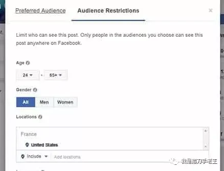 W是一家软件公司,刚刚开发出某项功能,这项功能可以惠及的人群包括创业者、社交营销从业者和电商从业者,对于其他人群意义不大。那么在发帖宣布这一功能的时候,选择针对这三种人群进行发布,而把其他人群排除在外。而通过“人群限制”进一步缩小范围:比如年龄限制在24-65岁之间、地点选择美国: